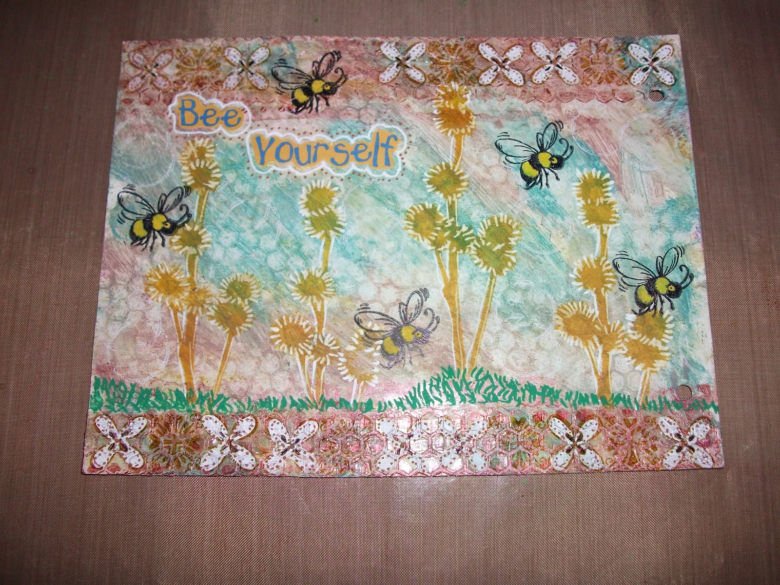 I got myself a small pot of mouding paste & had a play with it for this page, i used it on the top & bottom using it over a honeycomb stencil . I used the same stencil over the page with acrylic paint. The yellow stems are from Paperartsy .